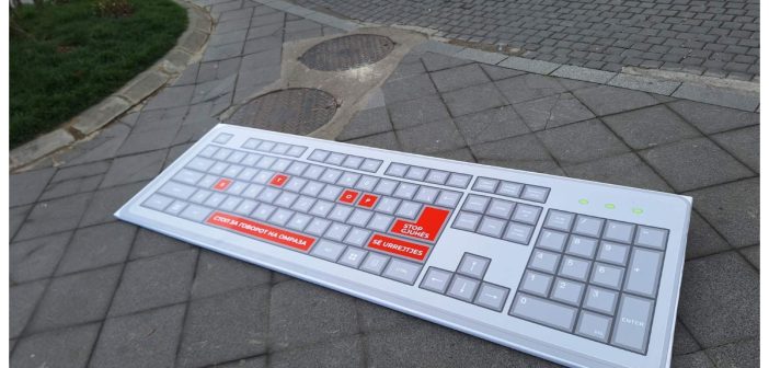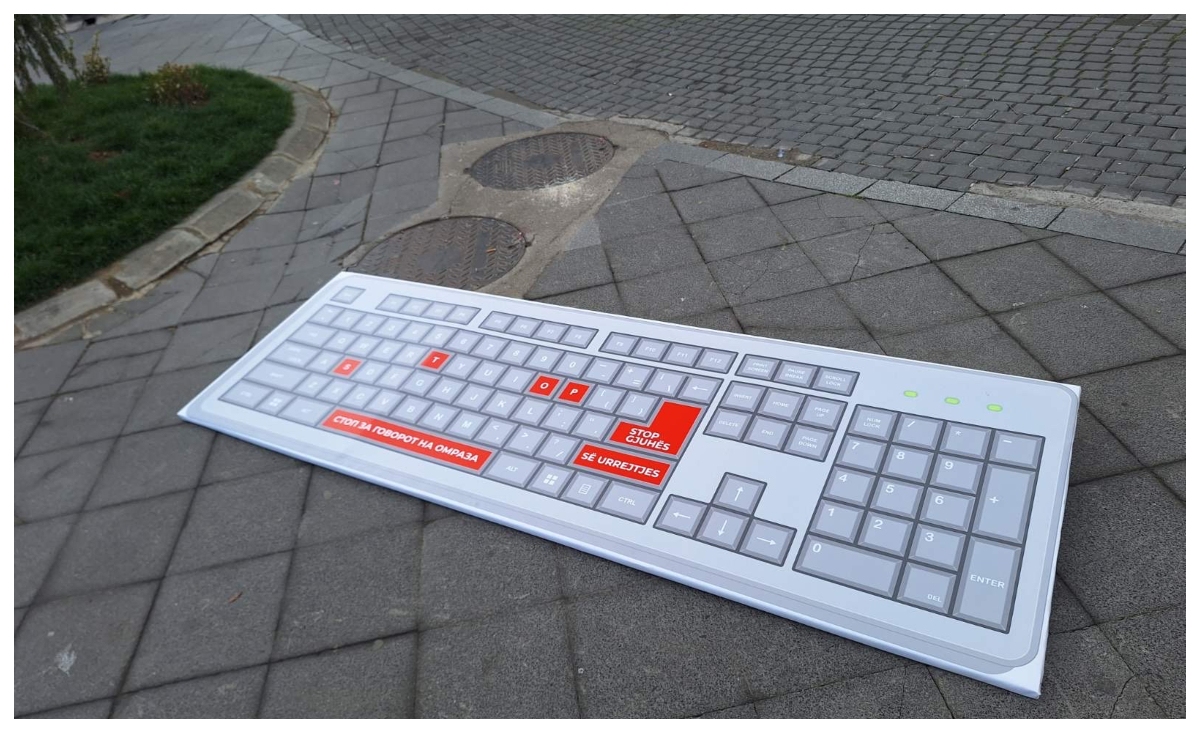 На скверчето кај КИМ, на булеварот „Партизански одреди“ во Скопје, денеска беше поставена уметничка интервенција во форма на голема скулптурална тастатура со порака „Стоп за говорот на омраза“.