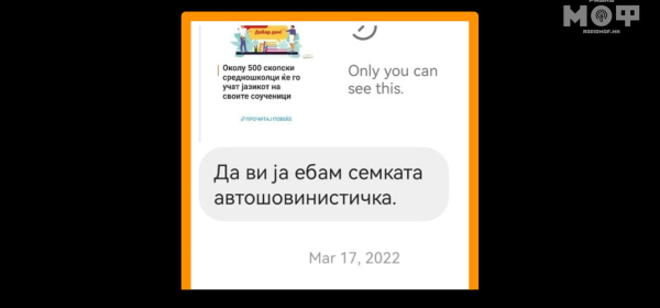 По повод 3 мај, Светскиот ден на слободата на медиумите, Радио МОФ реши да објави фотогалерија од „честитки“ од нашите читатели, објавени во коментари или напишани во поштенските сандачиња на нашите профили на социјалните мрежи. „Лечете се“, „и вие да си добиете по тамбура“, „Да ви ја е*ам семката автошовинистичка“, “„Мрш северџани предавници“, „Да ви … Continue reading [Галерија] Со „честитки“ од читатели Радио МОФ го одбележува Светскиот ден на слободата на медиумите