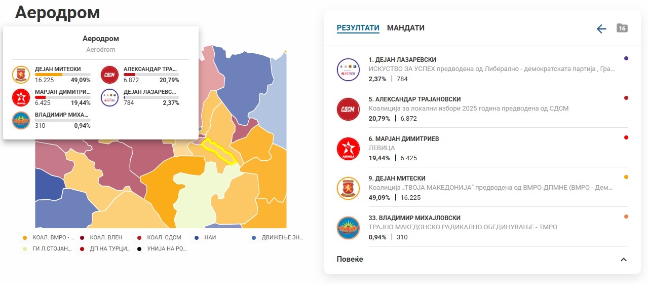 Во Општина Аеродром, каде што се обработени 99,90 отсто од избирачките места, води кандидатот на ВМРО-ДПМНЕ и актуелен в.д. градоначалник Дејан Митески со 49,09 проценти или 16.225 гласа. Зад него е Александар Трајановски од СДСМ со 20,79 проценти или 6.872 гласа. Двајцата ќе се соочат во вториот круг.