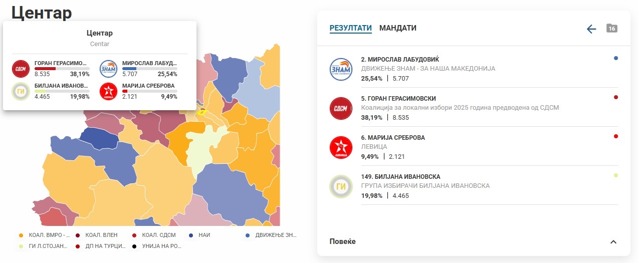 Во Општина Центар, по обработени 100 отсто од избирачките места, најмногу гласови доби кандидатот на СДСМ и актуелен градоначалник Горан Герасимовски со 38,19% или 8.525 гласа. Неговиот противкандидат Мирослав Лабудовиќ од движењето ЗНАМ, поддржан од ВМРО-ДПМНЕ, има 25,54% или 5.707 гласа. Тоа значи дека ќе влезе во вториот круг со Герасимовски.