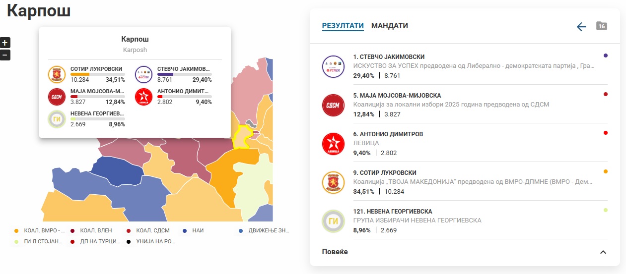 Во Карпош, според 100 отсто обработени гласачки места, во вториот круг ќе продолжат кандидатот на ВМРО-ДПМНЕ Сотир Лукровски и актуелниот градоначалник Стевчо Јакимовски од коалицијата „Искуство за успех“. Лукровски во првиот круг води со 34,51 проценти или 10.284 гласа, додека Јакимовски има 29,40 проценти или 8.761 глас.