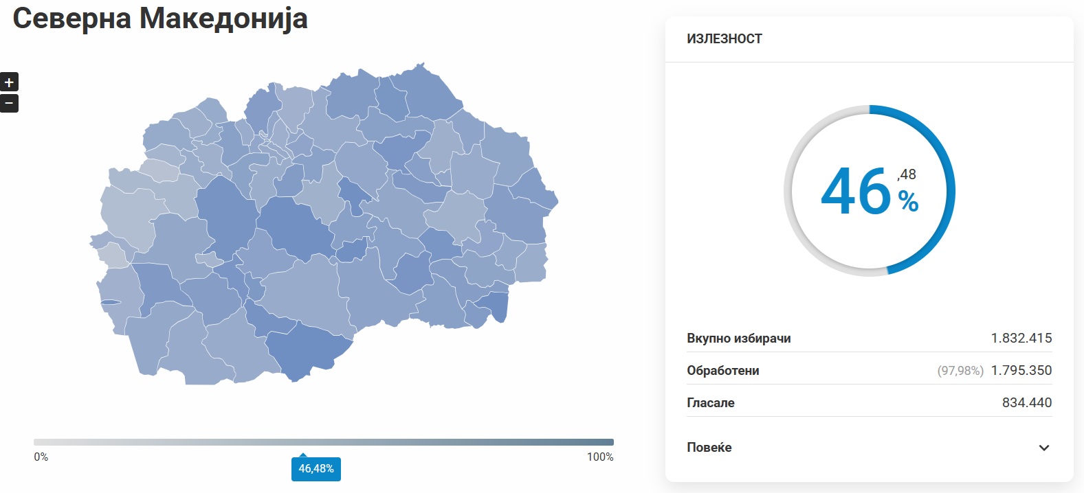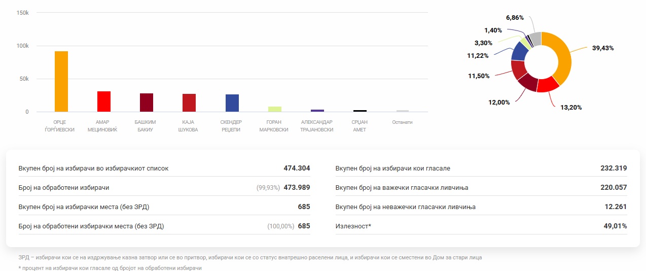 Според последната промена на Државната изборна комисија (ДИК) во 11:25 часот и 99,93% обработени гласови, Ѓорѓиевски во првата фаза од изборите освои 91.597 гласови или 39,43%, додека Мециновиќ има 30.659, односно 13,20%.