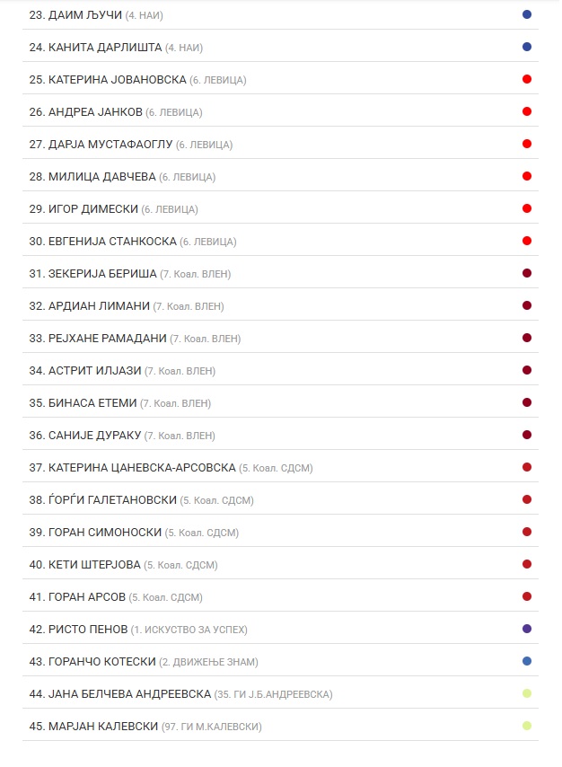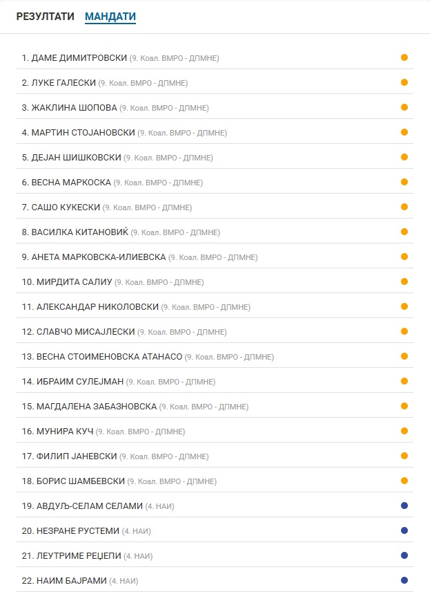 Односно, ВМРО-ДПМНЕ освои 18 мандати, Левица, Влен и ДУИ имаат по 6, а СДСМ – 5 мандати.