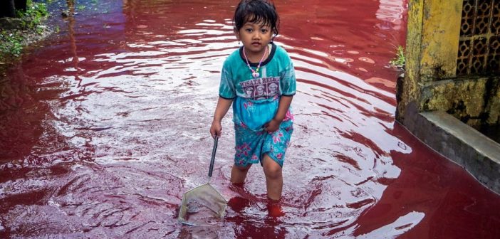 Надреална, крваво-црвена река го поплави индонезиското село Џенгот откако поплавите ја погодија фабриката за рачно боење на ткаенини. Фотографиите предизвикаа лавина од реакции на социјалните мрежи.