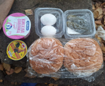 (На сликата: Храна за 2 дена во викенд за 1 лице: 2 лепчиња, 2 јајца, 2 кисели краставички, 1 павлака и 1 паштета. Вкупна цена во согласност со договорот – 478 денари)