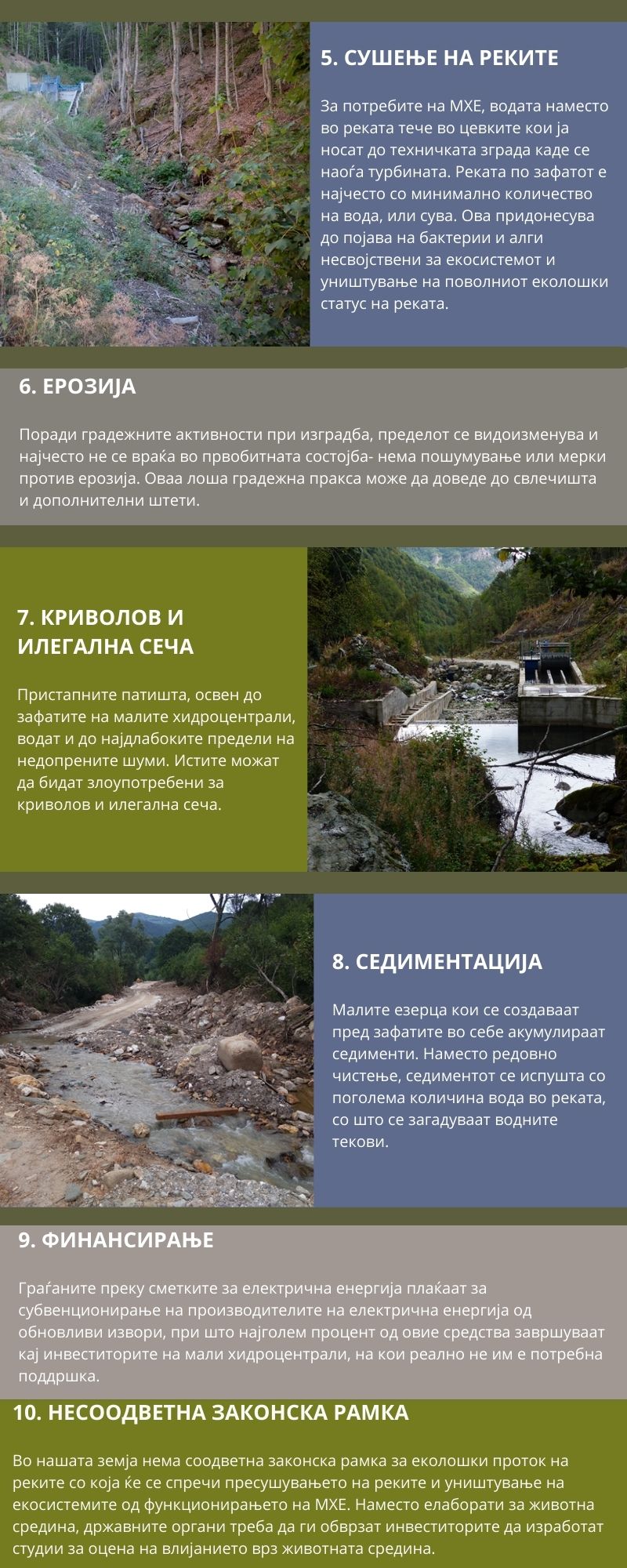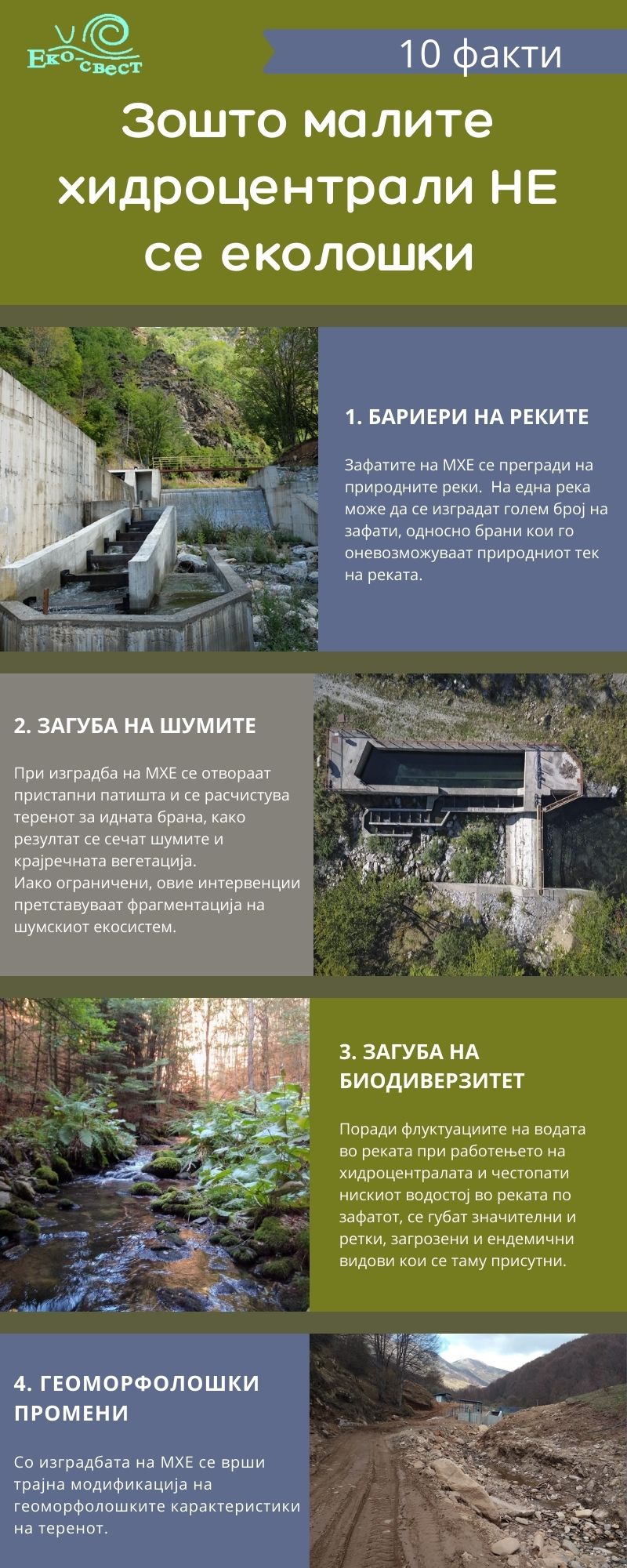 И другите независни анализи направени за влијанијата на малите хидроцентрали во државата досега покажаа дека кај нас не постои соодветна законска рамка и постапка која ќе го ограничи и елиминира ова штетно влијание, па така проектите продолжуваат да се градат во највредните подрачја без контрола и санкција.