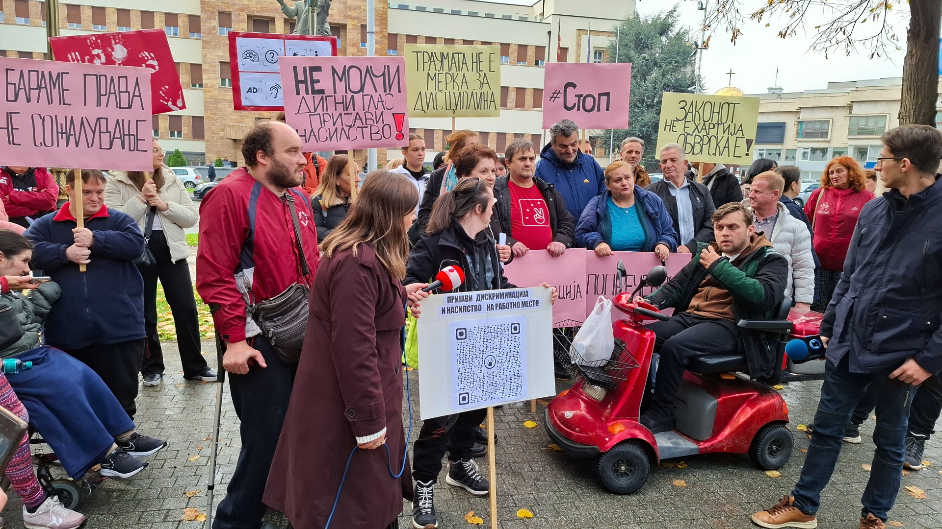 „Ние не бараме милост, бараме правда, бараме човечност. Бараме институциите да го спроведат законот, а не да го користат како параван за формално вработување без реална поддршка. Законот јасно дека предвидува лицата со инвадилитет мора да имаат соодветни услови за работа, заштита од малтертирање и дискриминација и дека секој работодавач е обврзан да обезбеди адаптирано работно место и почитување на нивното достоинство. Ние сме гласот на нашите деца. Нема да молчиме пред насилството. Нема да се помириме со дискриминацијата. Денеска пред Собранието испраќаме порака: Човековото достоинство нема попреченост, стоп за дискриминацијата, стоп за насилството на работното место“, порача Стојановска во име на насобраната група.