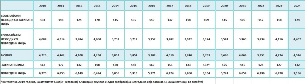 Имено, за 14 години од 2010 до 2024 година на целата територија се случувале во просек околу 4.009 сообраќајни несреќи со загинати и повредени лица годишно, при што вкупниот број на несреќи само со загинати изнесува 1.802. Најнизок број од 106 сообраќајни несреќи со загинати е регистриран во 2021 година, а највисок од 170 во 2013 година. Во ланската 2024 г. бројката одново почнала да расте и стасала до 124, после петгодишно движење на скалата од 106 до 118 сообраќајни несреќи со загинати лица.