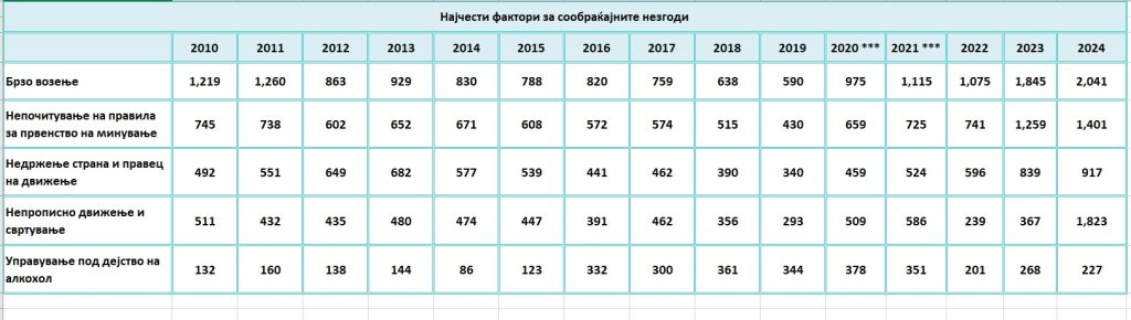 Притоа, аналитичките обработки покажале во статистиката на МВР дека пречекорување на брзината е констатирана како причина број 1 за сообраќајните несреќи. Од најниските 590 случаи во 2019 година, до највисоките 2.041 во 2024-тата година: