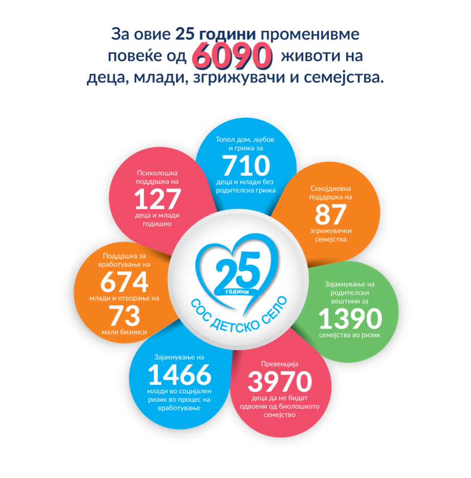 СОС Детско село Македонија годинава одбележува значаен јубилеј – 25 години постоење и поддршка на деца, млади и семејства во земјата. По тој повод, организацијата информира дека во изминатиот период помогнала да се променат животите на вкупно 6.090 корисници, нудејќи им можност за посигурна иднина.