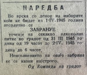 Во Скопје, како најголем град и административен центар, изборите се одржуваат нешто подоцна – на 1 април 1945 година, поради дополнителните организациски подготовки.