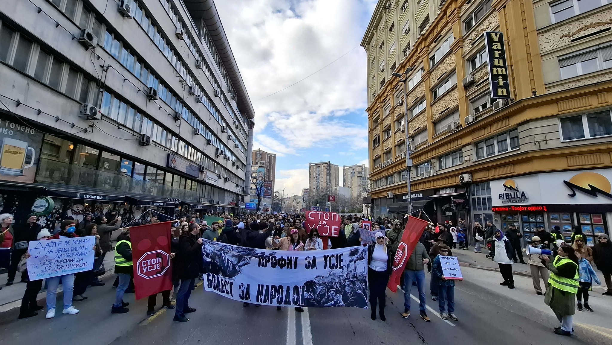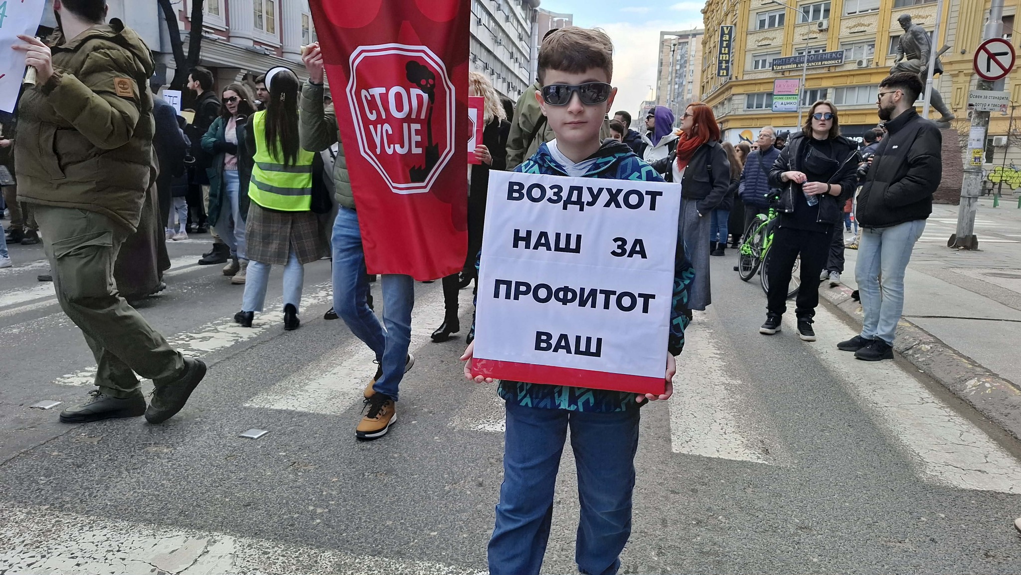 Напред маршот го предводеше голем транспарент „Профит за Усје, болест за народот“.