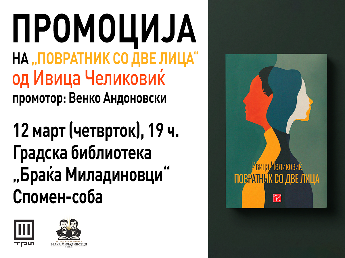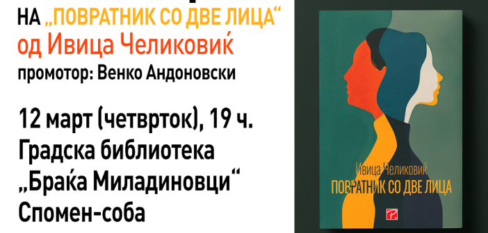 Денес, од 19 ч., во Спомен-собата на Градската библиотека „Браќа Миладиновци“, ќе се одржи промоција на најновиот роман од Ивица Челиковиќ, „Повратник со две лица“.