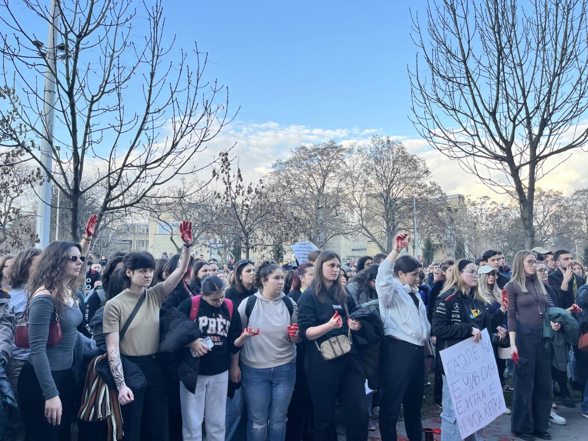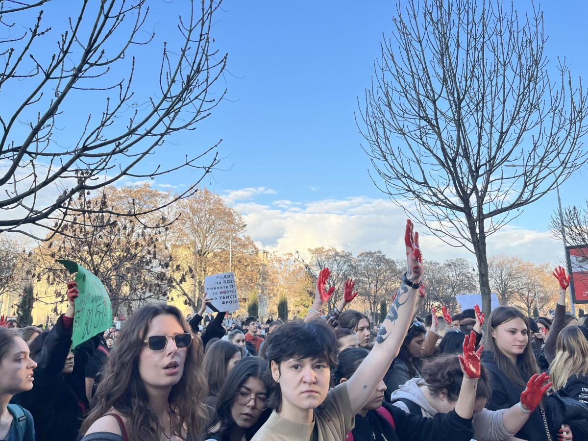 Бројни граѓани оставија траги од „крвави дланки“ кај Основниот кривичен суд во Скопје, на протестот на кој се бараше правда за трагичната смрт на 22-годишната Фросина Кулакова која пред два дена беше прегазена на булеварот „Партизански Одреди“.