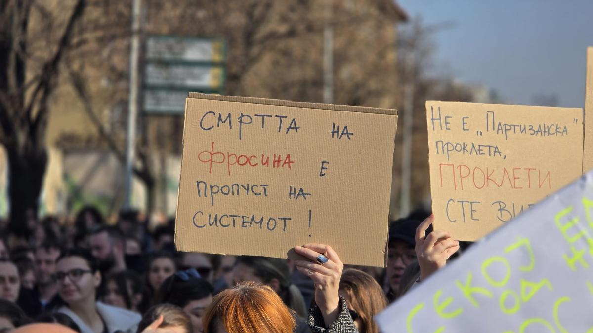 Граѓаните носеа транспаренти на кои пишуваше „Обвинители = соучесници, убијци“, „Смртта на Фросина е пропуст на системот!“, „Не е ‘Партизанска’ проклета, проклети сте вие“, „Не е несреќа, туку убиство“, „Врските не враќаат човечки живот“…