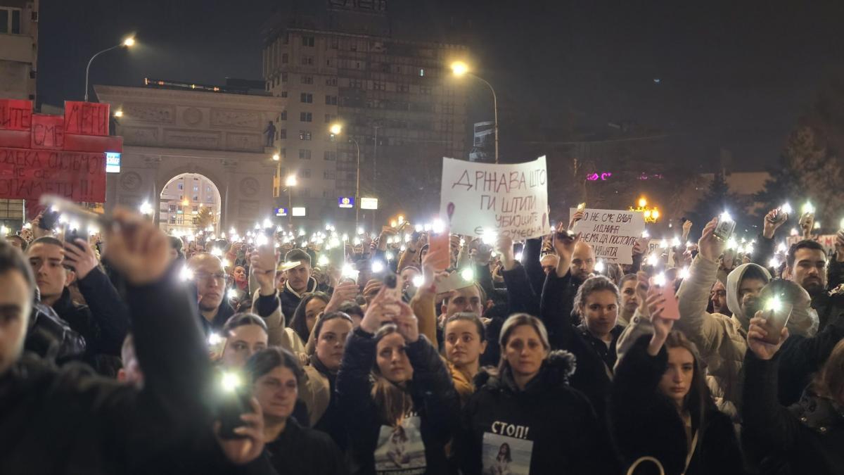 Протестот кој започна на „Партизански Одреди“ продолжи кон Собранието и Кривичниот суд каде се одржа триминутен молк, а за време на молкот, граѓаните светеа со подигнати телефони нагоре.