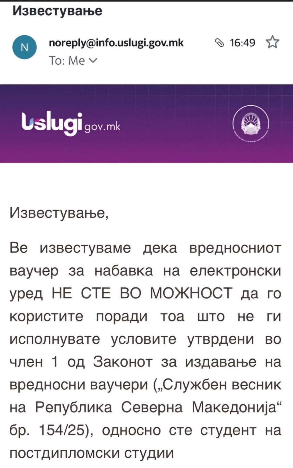 Но, најголемата забуна се случила со студентите на постдипломски студии, кои како што велат, најпрво добиле пораки дека нивното барање е прифатено, а потоа уште една порака во која се вели дека немаат право на ваучер затоа што се студенти на втор циклус студии.