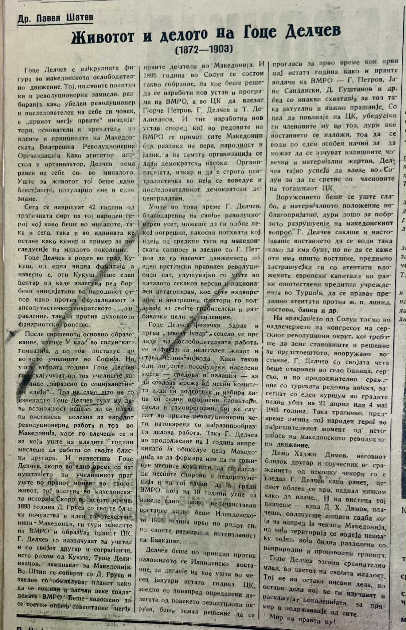 Во рамки на рубриката „Старо-Нова Македонија“ Радио МОФ споделува статија објавена во весникот Нова Македонија во 1945 година, од страна на д-р Павел Шатев, првиот министер за правосудство во Македонија во рамки на Југославија и еден од најблиските пријатели и соработници на Гоце Делчев.