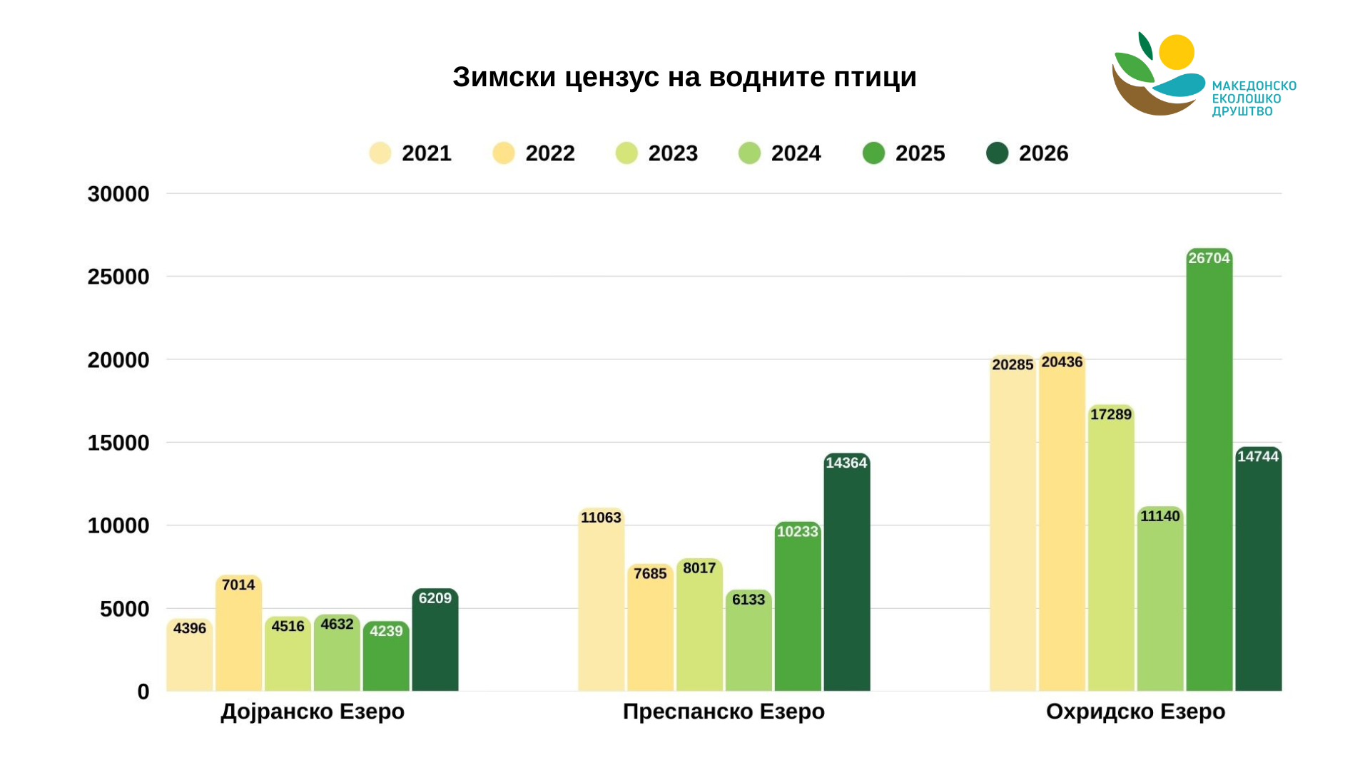 Над 35.300 единки од 44 различни видови на водни птици беа попишани за време на зимското пребројување на птици на трите природни езера во Македонија, што под водство на Македонското еколошко друштво (МЕД) кај нас се случува секој јануари од 2010 година наваму, како дел од Меѓународниот зимски цензус на водни птици.