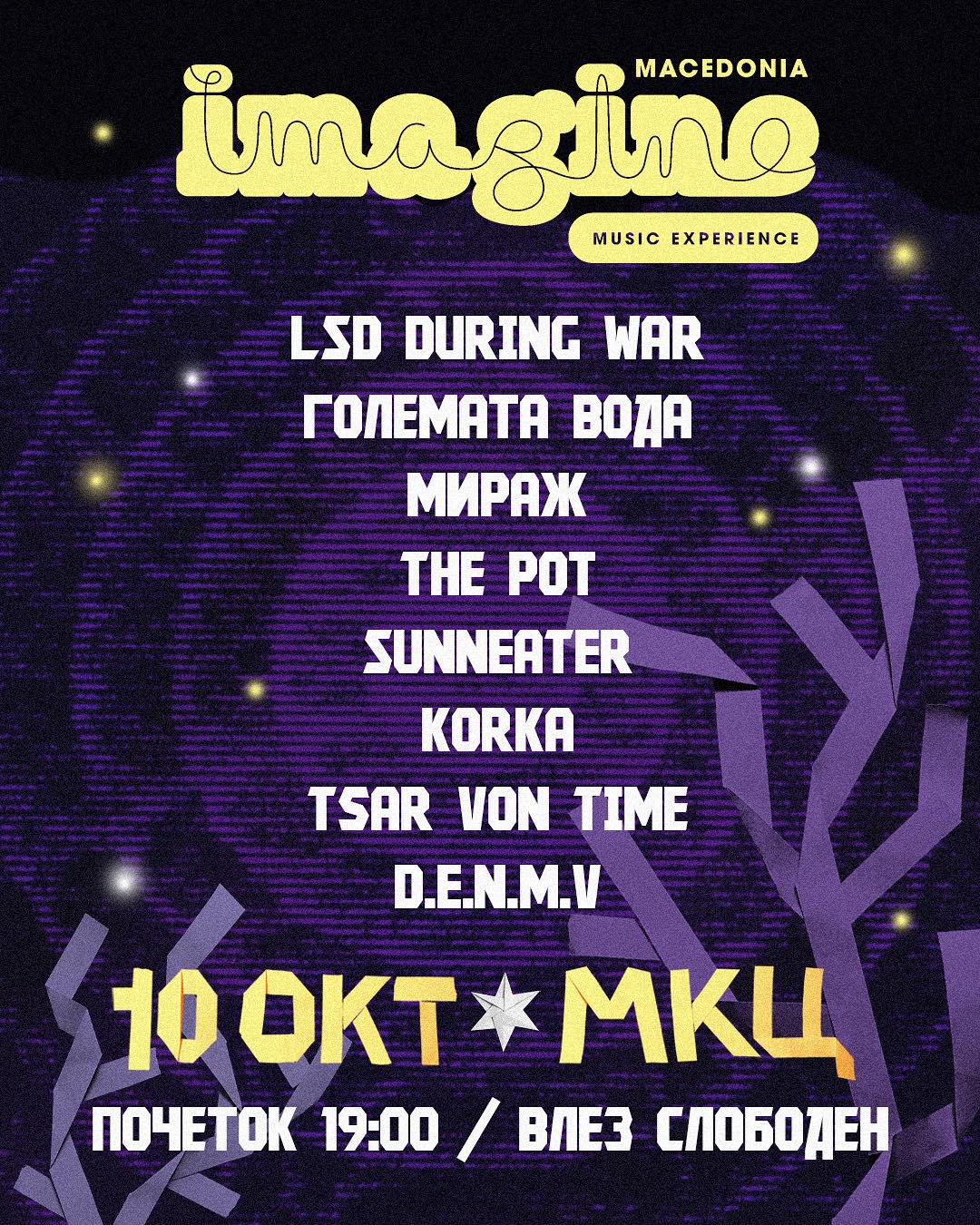 На главната фестивалска бина, во денсинг салата „25 мај“ во МКЦ, осум млади бендови од Македонија ќе имаат шанса да обезбедат свој настап на главната фестивалска вечер, т.е. наредниот ден на 11 октомври, или настап на „Imagine“ во Брисел.